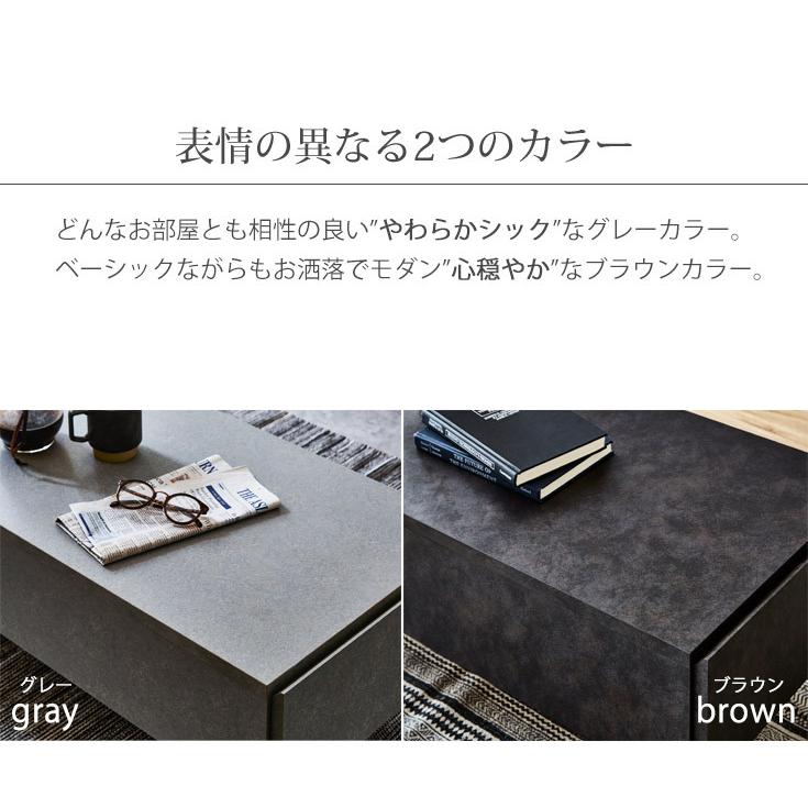 商品情報 重厚感があり、大人の雰囲気漂うセラミック素材を再現したシンプルで無機質な見た目は、様々なテイストインテリアとマッチします。 安心・信頼の日本製です。 《国産センターテーブル 幅105cm》 【サイズ】 幅105cm×奥行き45cm×高さ34.5cm 【材 質】 前板・天板:MDF/強化紙、脚:ブラックアイアン 【仕 様】 引出し:フルオープンレール 【カラー】 グレー、ブラウン 【備 考】 国産品、完成品(脚のみお客様にて取付け) 【送 料】 送料無料(北海道・東北・沖縄・離島等の一部地域を除く) 【関 連】シンプル おしゃれ 収納 収納家具 おすすめ 安い インテリア 一人暮らし モカ |