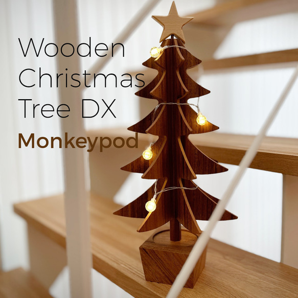 モンキーポッド材を使用した、木目の美しいシンプルなクリスマスツリーです。 オシャレなお部屋に溶け込むように可能な限りシンプルに