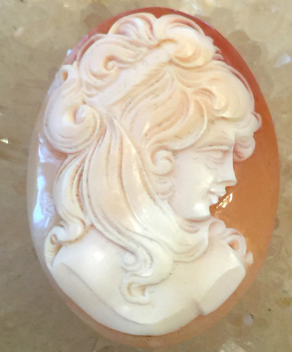本場イタリア製シェルカメオです。 繊細に表現された作家作品です。髪の毛一本一本を丁寧に加工し、海外などでも大人気なデザインです。 国内では、かなりのお値段で流通されている作品です。 素材となる貝の厚みもありしっかりしたカメオになります。 カメオは、昔ながら受け継がれるジュエリーの一つです、カメオ作品を一つ本場イタリアシェルカメオで思い出に残る作品を製作してみては、いかがですか?。 今回出品のカメオは、私が長年に渡り材料を買い付け収集したコレクションの一つになります。 アクセサリー作家の皆様にカメオで新たな素敵な作品を作って頂けたらと思い今回かなりお買得なお安い値段で出品しております。 *サイズ/4.5センチ×3.5センチ 次回このプライスでの出品は、ありえません。 この機会に、ぜひお早目にカメオジュエリーを格安で手に入れて下さい。 加工が必要でしたら、加工依頼もご相談頂けます。 [シェルカメオ] 古代より装飾品として愛され、古くはローマ時代のものも発掘されている。近年ではイタリアなどの国で工芸品として貝殻に彫り出したシェルカメオが、装飾品として珍重される。溶岩に掘り出したラーヴァカメオより、ストーンカメオに高価なものが多い。カメオに彫られた人物像をさらにダイヤモンド、ルビーなどで装飾したものは、カメオ・アビレと呼ばれる。 彫りの高さや、石の層の色の出方なども重要視されるが、鑑賞のポイントとなるのは、やはり彫りの出来となる。また、シェルカメオで一般的に言われる、巻き貝の左右の向きはあまり重要ではない。 現在のシェルカメオは、南イタリアのナポリ近郊の港町、トーレ・デル・グレコで製作されており、多くのカメオ彫刻家がそれぞれの特性などを生かし、現代アートカメオを製作している。