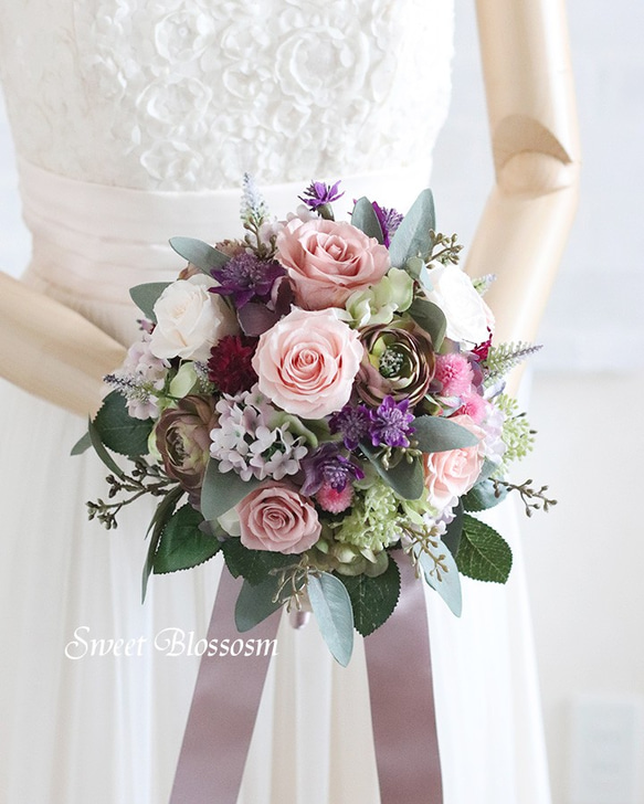 プリザーブドフラワーのブーケ・ブートニアの2点セットをオーダーメイドで承っております。 写真はオーダーメードでご注文いただいた作品の一例でアンティークピンクのプリザーブドローズを中心にパープル系のアーティフィシャルフラワーや小花、グリーンなどをあわせた落ち着いた中にも華やかさがあるブーケです。 メインのお花をプリザーブドフラワー、グリーンや小花はブーケに合うドライフラワーや質の高いアーティフィシャルフラワー(造花)を使用しています。 プリザーブドフラワーのナチュラルブーケ・ブートニアの2点セットは18000円~承ります。 持ち手部分をクラッチブーケ風(茎を束ねたタイプ)にすることも可能です(追加料金1000円) お花のお色や雰囲気などご希望のイメージとご予算をお打ち合わせ内容で制作させていただきます。 また掲載写真と同じブーケのご希望も承りますのでご注文前にお問い合わせください。(但し作品に使用している花材が廃盤やリニューアル等により花材は代替品を使用することがございます。) まずは「質問・オーダーの相談をする」からお気軽にご相談連絡をください。 ご希望イメージとご予算などオーダー内容にOKいただけましたら別途オーダーページをご案内させていただきます。 ご注文後は、花材の色合わせからブーケ等の完成までお写真のやり取りで確認していただきながら制作を進めていきます。 (ブーケサイズ)直径 約24~25cm ※それ以上のご希望の場合もご予算に合わせてご提案させていただきます。 (ブートニア)ブーケと同様の花材を使って制作します。 ※お揃いのヘッドパーツもご希望の場合はお問い合わせください。 ☆★☆*…*…*…*…*…*…*…*…*…*…*…*…*…*…*…*★☆★ 素材:プリザーブドフラワー、ドライフラワー・アーティフィシャルフラワー 受注後制作いたします。 お届け日については事前のお打ち合わせで取り決めさせていただきます。 通常は発送まで約3週間(21日)程度お時間をいただいおります。 お急ぎの場合など納期のご希望ある場合はご購入時に備考欄にご記入お願いします。 *********** ウエディングブーケ * ウエディング * ブーケ * ナチュラルブーケ * 造花 * ラウンドブーケ * アーティフィシャルフラワー * プリザーブドフラワー * 結婚式 * ブライダル