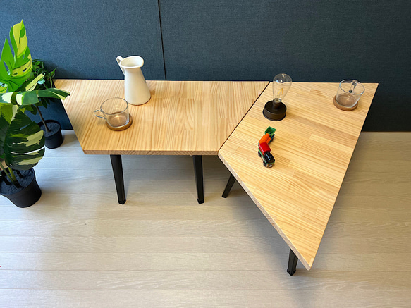 栄町工房です。 ご覧頂き誠に有難う御座います。 ◎上品な木目のパイン材を使用したローテーブルです。 ◎6角形の天板を2分割し、それぞれ独立して使える様に脚を付けました。 ◎単独使用はもちろん、様々なアレンジが可能です。 ◎天板の裏側には反り防止兼補強材を取付けておりますので末永くお使い頂けます。 ◎ビス穴は全て埋木処理を施しております。 ◎脚は金属製折りたたみ脚ですので収納が簡単です。 ◎世界に一つしかない木目、如何でしょうか? 【寸法】 直径90cm、高さ32cm 【仕上げ】 ウレタンコーティング 【納期】 10〜14日間程度 【商品の注意点等】 ・ウレタンコーティングは耐光性・耐水性に優れておりますが、水に濡れた場合は早めに水気をお拭き取り下さい。 ・木目は素材によりまちまちとなりますが、逸品モノとしてご了承ください。 ・寸法に関しましては多少の誤差が生じる場合が御座います。 ・金物類の仕様が変更になる場合が御座います。 ・稀に塗装ムラや垂れ跡が残る場合が御座います。 ・天然素材を使用しておりますので、傷や欠けや節穴、凹み等が残る場合が御座います。 【ウォールシェルフのお取付け】 ・お取付けの際は壁の下地を狙ったビス打ち固定をお勧め致します。 ・ハンガーが壁下地と合わない場合は、ハンガーの位置をご調整下さい。 ・取付用ネジは付属致しません。 ・木材と木材との間に隙間が出てしまう場合が御座います。 ・木材の歪み等で壁面に全ての面が接地しない場合が御座います。 【変更オーダーについて】 ・規格の都合でご希望に添えない場合も御座いますが、極力お客様のご要望に叶う様にご対応致します。 ・サイズ変更、高さ変更、色替え、脚の仕様変更などのご要望が御座いましたらお気軽にお問合せ下さい。 ・完全オーダーメイドも承っております。 【お知らせ】 ・私たちは素材本来の美しさを活かした家具造りを心掛けております。 ・取扱商品のお値段は全て送料込みとなっております。 ・当工房はお気軽な家具屋を目指しておりますので、ご質問等御座いましたらお気軽にご連絡下さい。 ・是非ホームページにもお越し下さい。 ・あまり更新してませんがインスタもやってます。